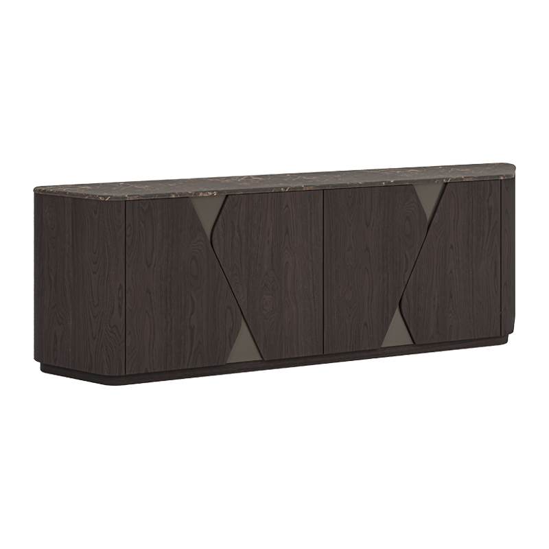 Anchored by a trapezium top, the Cosimo Sideboard asserts a bold architectural presence through its disciplined form. Four doors are defined by a unique, angular composition of wood and metal, creating an illusionary opening that conceals storage