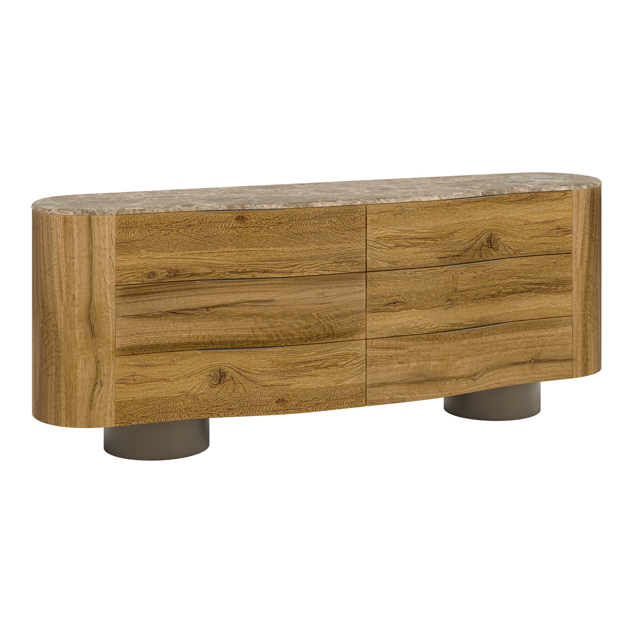 Curved oak doors and a marble top lend the Velutto Dresser a quiet sense of indulgence. Resting on slender metal legs, it expresses warmth and grace in equal measure. Six drawers glide open to reveal a thoughtfully refined space for daily living.